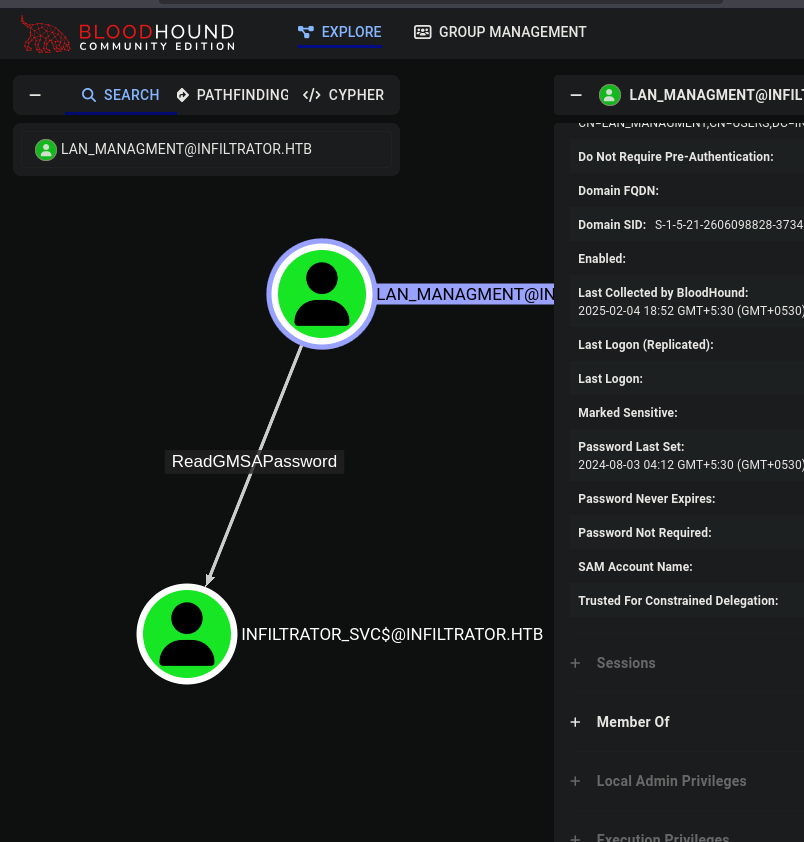 Looking at BloodHound, lan_managment can read the GMSA password: