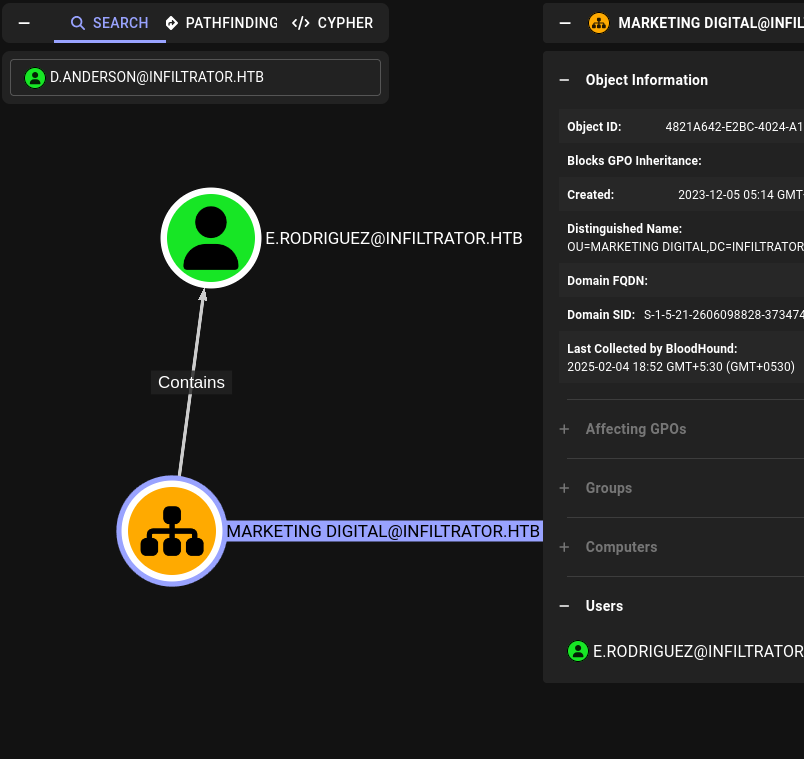 Anderson has GenericAll on the Marketing Digital OU, and e.rodriguez is in this OU. We can abuse this to change rodriguez’s password.