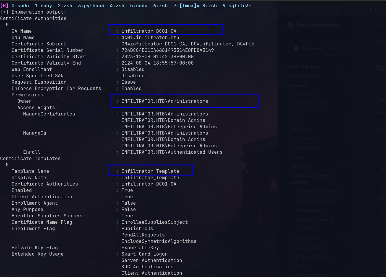 Infiltrator is one of the best machines I’ve done. It’s a proper Active Directory box that tests everything from initial enumeration to complex privilege escalation chains. The Output Messenger part was unique and the ADCS finale was satisfying.